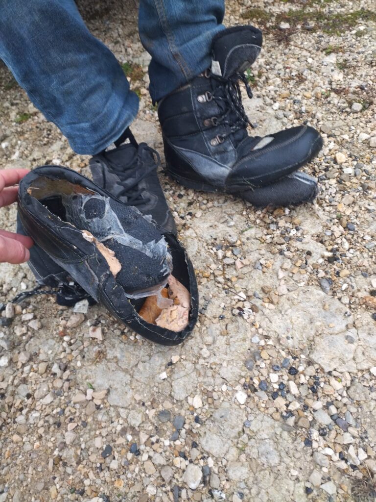 Nous croisons un soutirage qui attire notre curiosité (point GPS de Pierre), mais à l’encens aucun courant d’air n’apparaît. On découvre alors que les pompes de Christian sont solubles à l’eau, et se dépiautent en milles morceaux 🥾 Pas grave, le brave homme n’a pas peur de marcher en chaussettes sur un sol trempé 🧦